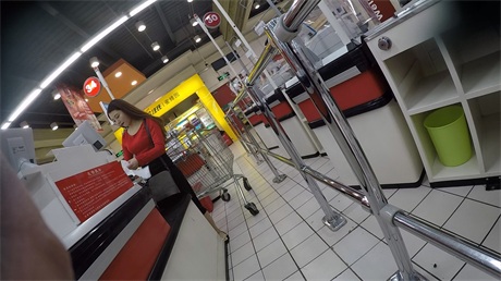 ❣️推荐❣️超市抄底【嚼口香糖的红衣长裙美女】长裙高难度抄底,艰难拿下,性感的白内裤1V