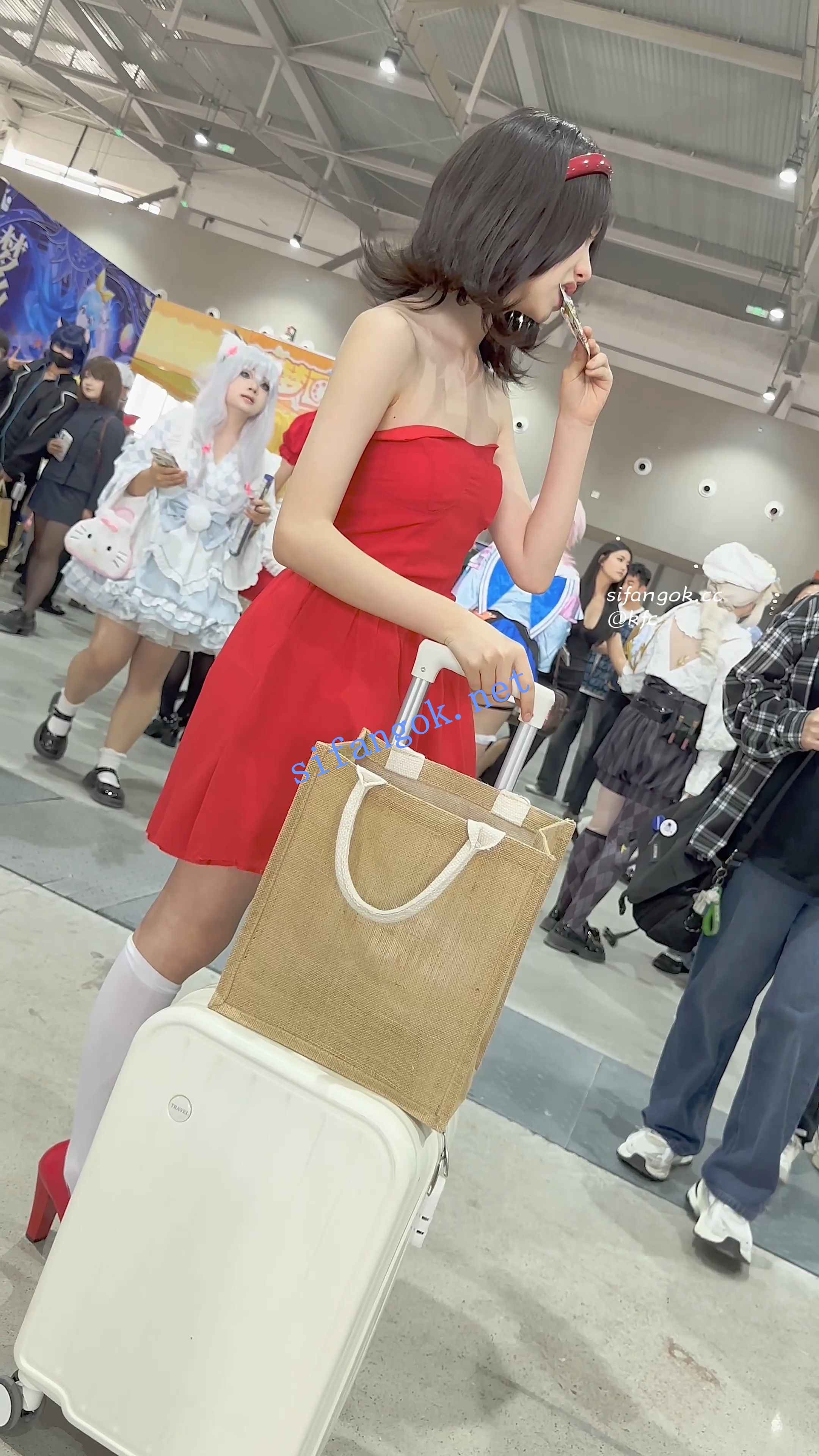【KFC】学生妹打扮精致逛展·红色抹胸长裙·一次性内内贴着CD